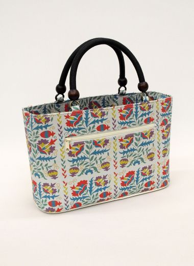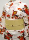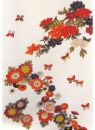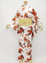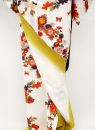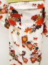 白地にカラフルな花に蝶が舞っているレトロ調の着物です。
