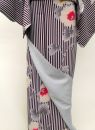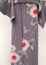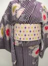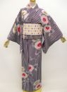 薄紫地にストライプと花柄が冴えるレトロ調のモダンな着物です。