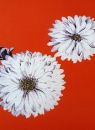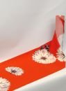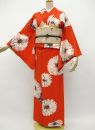 朱色地に大胆に菊の花をデザインしたレトロ調の着物です。