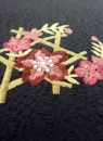 黒の縮緬地にイエローの縦ラインと刺繍の花柄が効いています。