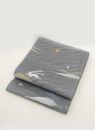 薄いグレーの生地に、月とうさぎが織り込まれています。ところどころにラメ糸を使用しており、キラキラしている部分がポイントになります。